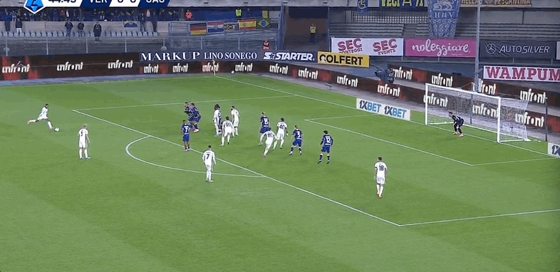 71’法德拉造点,皮纳蒙蒂主罚被扑补射命中,维罗纳0-1萨索洛