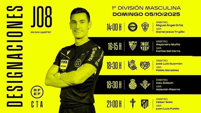 10月4日,西班牙足协官方公布了周日西甲比赛的裁判安排,亚历杭德罗-穆尼斯将执法塞维利亚vs巴塞罗那。