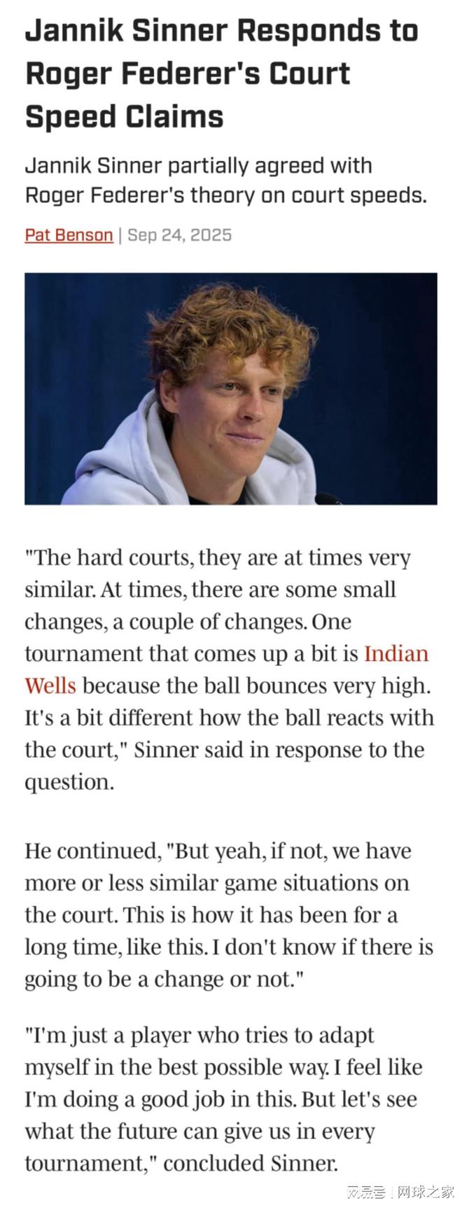 不过昨天的比赛过后,兹维列夫的一则“观点”引发热烈讨论,起因是今年上海大师赛的场地速度有所改变。加上之前费德勒在接受罗迪克采访时也聊到了这点,辛纳就在赛后被问到对于兹维列夫的发言他怎么看,世界第二在接受采访时坦言,事情的真相并不是如此,赛事方不可能因为想看到阿辛决就故意去改变球场原有的速度。