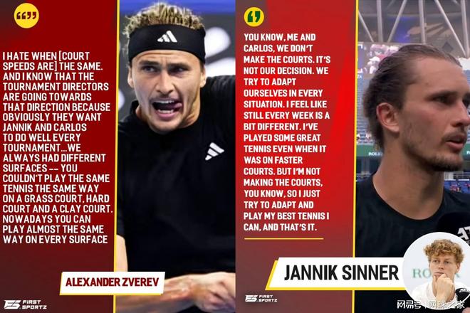 换个角度想,与其说赛事为了让阿卡和辛纳两人取得好成绩从而有意改变场地速度,倒不如看看这二人包括兹维列夫,今年在全场地的表现究竟如何。