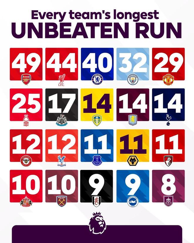 在本赛季英超已无开局不败球队后,英超官方列出了本赛季英超20支球队各自的最长英超不败纪录。