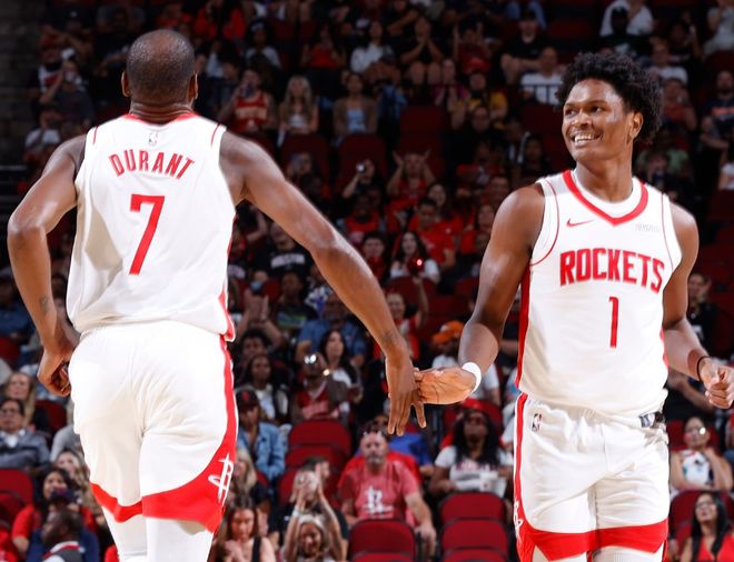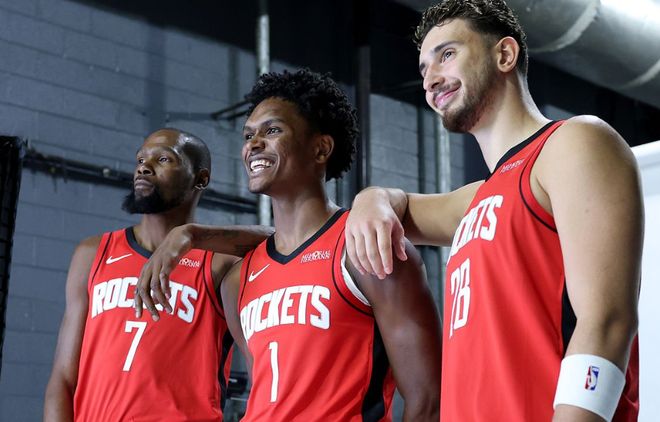 在火箭,杜兰特的“三巨头”同伴是中锋申京和侧翼阿门-汤普森。申京是约基奇式的技术型传球手,上赛季首次入选全明星,并在今年休赛期赢得了欧洲杯的银牌。阿门-汤普森是一名防守悍将,今年秋天被NBA总经理们投票选为最有可能迎来爆发赛季的球员。