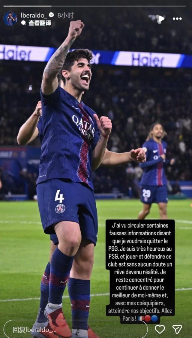 11月1日宣 巴黎后卫贝拉尔多更新社媒动态,辟谣离队传闻。贝拉尔多社媒晒出身穿巴黎球衣庆祝的照片,配文:“我看到一些不实消息称我想离开巴黎圣日耳曼。我在巴黎圣日耳曼非常开心,为这家俱乐部效力对我来说无疑是梦想成真。”“我将继续专注于发挥最佳水平,与队友们共同实现我们的目标。加油巴黎!”